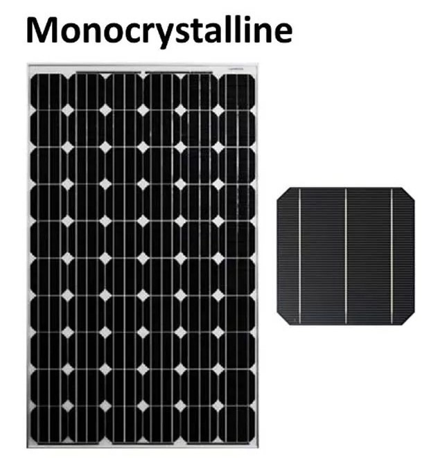 1. แผงโซล่าเซลล์ชนิดโมโนคริสตัลไลน์ (Monocrystalline Silicon Solar Cells) ทำมาจาก ผลึกซิลิคอนเชิงเดี่ยว (mono-Si) หรือบางทีก็เรียกว่า single crystalline (single-Si) สังเกตค่อนข้างง่ายกว่าชนิดอื่น เพราะจะเห็นแต่ละเซลล์ลักษณะเป็นสี่เหลี่ยมตัดมุมทั้งสี่มุม และมีสีเข้ม ประสิทธิภาพสูงกว่าโพลีคริสตัลไลน์ แต่แพ้อุณหภูมิสูง แสงน้อยก็ผลิตไฟได้ ปัจจุบันพัฒนาเป็น Half cell และมีแผ่นสะท้อนแสงด้านหลังทำให้มีประสิทธิภาพสูงขึ้น (ประสิทธิภาพ 18-25%) อายุการใช้งานประมาณ 20-30 ปี |