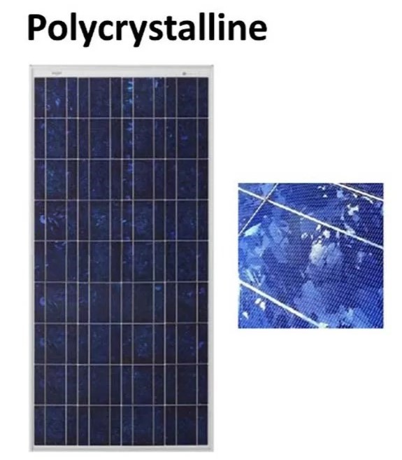 2. แผงโซล่าเซลล์ชนิด โพลีคริสตัลไลน์ (Polycrystalline Silicon Solar Cells) เป็นแผงโซล่าเซลล์์ชนิดแรก ที่ทำมาจากผลึกซิลิคอน โดยทั่วไปเรียกว่า โพลีคริสตัลไลน์ (polycrystalline,p-Si) แต่บางครั้งก็เรียกว่า มัลติ-คริสตัลไลน์ (multi-crystalline,mc-Si) โดยในกระบวนการผลิตแผงโซล่าเซลล์ชนิดนี้ เกิดจากการหลอมซิลิคอนหรือแก้วให้เหลว แล้วมาเทใส่โมลด์หรือแม่แบบที่เป็นสี่หลี่ยม พอเย็นตัวแล้วนำแท่งแก้วสี่เหลี่ยมนั้นมาตัดเป็นแผ่นบางๆ จึงทำให้เซลล์แต่ละเซลล์เป็นรูปสี่เหลี่ยมจัตุรัสไม่มีการตัดมุม สีของแผงจะออกสีน้ำเงินฟ้าไม่เข้มมาก มีประสิทธิภาพต่ำกว่าโมโนคริสตัลไลน์ ทนอุณหภูมิสูงได้ดี (ประสิทธิภาพ 15-20%) อายุการใช้งานประมาณ 20-30 ปี |