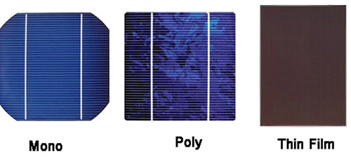 3. แผงโซล่าเซลล์ ชนิดฟิล์มบาง (Thin Film Solar Cells) โซล่าเซลล์ ชนิดฟิล์มบาง (Thin Film Solar Cell, TFSC) คือ การนำเอาสารที่สามารถแปลงพลังงานจากแสงเป็นกระแสไฟฟ้า มาฉาบเป็นฟิล์มหรือชั้นบางๆ ซ้อนกันหลายๆชั้น จึงเรียก โซล่าเซลล์ชนิดนี้ว่า ฟิล์มบาง หรือ thin film แผงโซล่าเซลล์ ชนิดฟิล์มบางจึงแตกต่างกันออกไป ขึ้นอยู่กับชนิดวัสดุที่นำมาใช้ฉาบ ได้แก่ อะมอร์ฟัส Amorphous silicon (A-Si) ,Cadmium Telluride (CdTe),Copper Indium Gallium Selenide (CIS/CIGS) และ Organic Photovoltaic Cells (OPC) ประสิทธฺภาพต่ำกว่าโมโนคริสตัลไลน์ ประมาณ 3-4 เท่า ไม่นิยมใช้เนื่องจากใช้พื้นที่มาก อายุการใช้งานสั้นประมาณ 5-10 ปี (ประสิทธิภาพ 5-8%) |