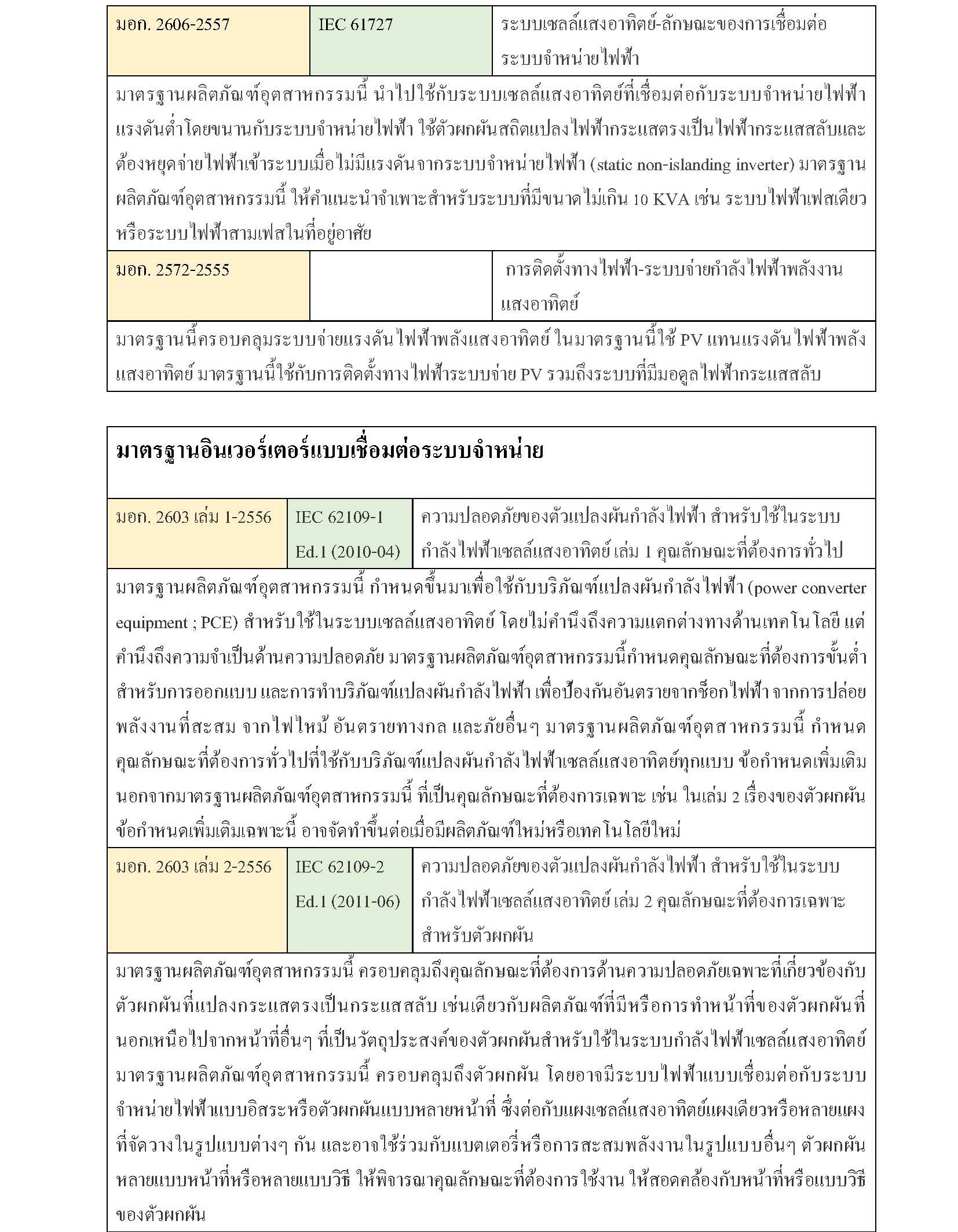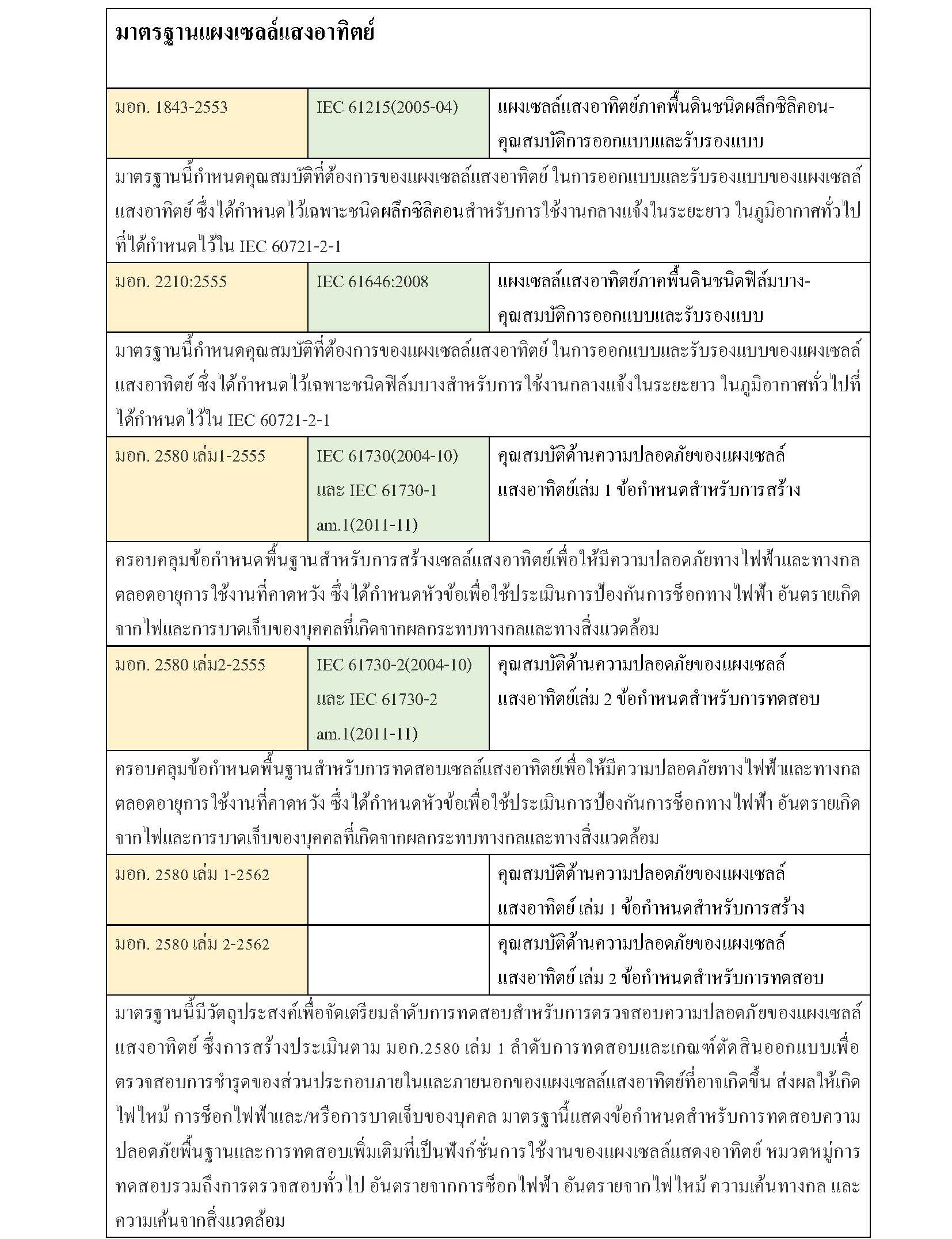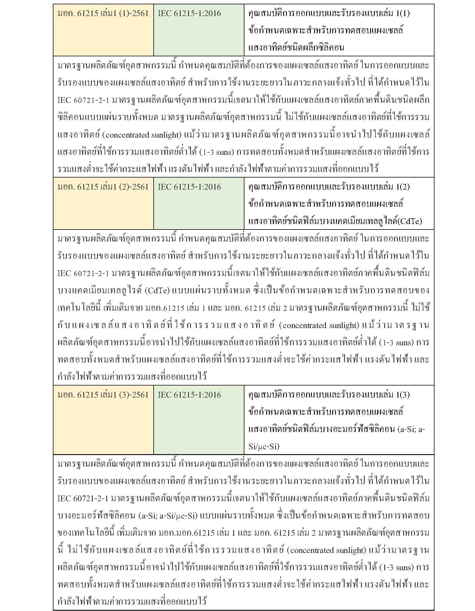 3. มาตรฐานสากล หน่วยงาน International Electrotechnical Commission (IEC) ได้จัดทำมาตรฐานเกี่ยวกับแผงเซลล์แสงอาทิตย์และอุปกรณ์ประกอบ