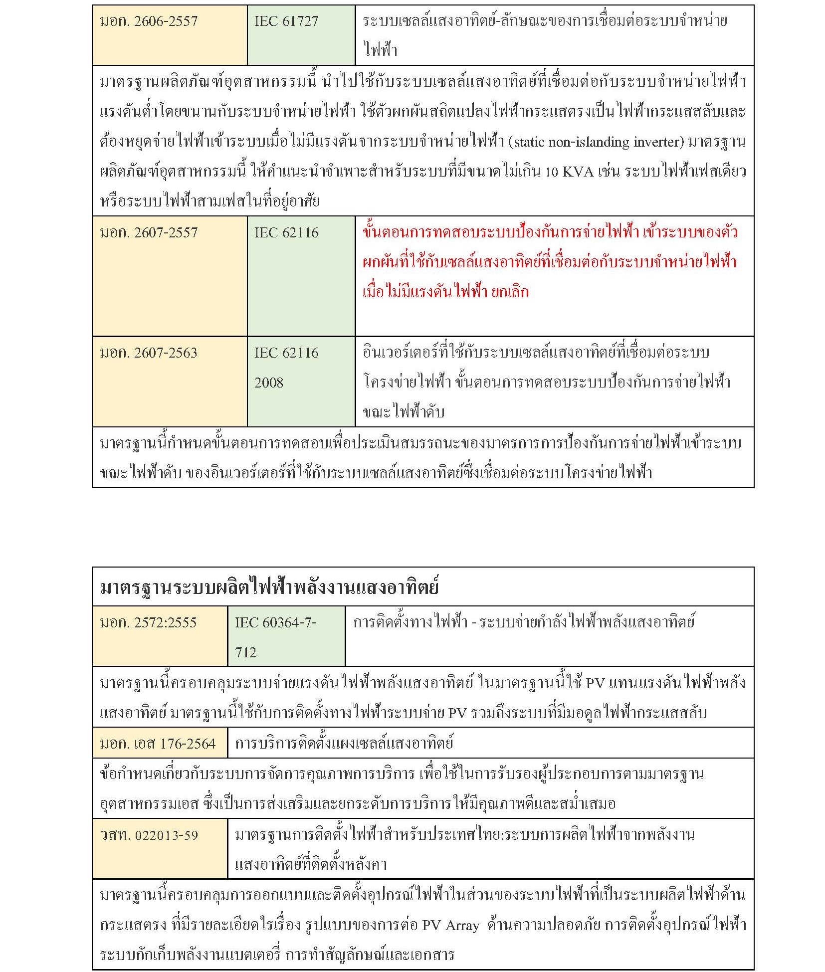 มอก. คืออะไร? สำนักงานมาตรฐานผลิตภัณฑ์อุตสาหกรรม (สมอ.) เป็นผู้ออกข้อกำหนด “มาตรฐานผลิตภัณฑ์อุตสาหกรรม โดยใช้ชื่อย่อเป็น มอก.” (Thai Industrial Standard) ซึ่งหมายถึงข้อกำหนดทางวิชาการที่กำหนดขึ้นเพื่อเป็นแนวทางแก่ผู้ผลิตในการผลิตสินค้าให้มีคุณภาพในระดับที่เหมาะสมกับการใช้งานมากที่สุด แผงโซล่าเซลล์และส่วนประกอบมีมาตรฐานที่เกี่ยวข้องอะไรบ้าง? โซล่าเซลล์และส่วนประกอบจำเป็นต้องมีมาตรฐาน เพื่อควบคุมประสิทธิภาพและความปลอดภัยด้านการใช้งาน ทั้งนี้ มาตรฐานผลิตภัณฑ์อุตสาหกรรมเซลล์แสงอาทิตย์หรือสินค้าโซล่าเซลล์และส่วนประกอบที่ทาง สมอ. ได้มีการกำหนดให้มีการใช้งานในไทยนั้น มีทั้งมาตรฐานทั่วไป มาตรฐานอุตสาหกรรมเอส และมาตรฐานสากล ดังนี้ 1. มาตรฐานทั่วไป เป็นมาตรฐานอุตสาหกรรมของไทย (มอก.) ที่ สำนักงานมาตรฐานผลิตภัณฑ์อุตสาหกรรม (สมอ.) ได้นำมาตรฐานสากล International Electrotechnical Commission (IEC) มาปรับใช้เป็นมาตรฐานที่เกี่ยวของกับอุปกรณ์ในระบบผลิตไฟฟ้าจากแสงอาทิตย์ของไทย เช่น มาตรฐานแผงเซลล์แสงอาทิตย์ มาตรฐานอินเวอเตอร์แบบเชื่อมต่อระบบจำหน่าย และมาตรฐานระบบผลิตไฟฟ้าพลังงานแสงอาทิตย์ โดยมีรายละเอียดดังตาราง 2. มาตรฐานอุตสาหกรรมเอส (มอก.S) เป็นข้อกำหนดเกี่ยวกับระบบการจัดการคุณภาพการบริการเพื่อใช้ในการรับรองผู้ประกอบการและยกระดับการบริการให้มีคุณภาพที่ดี