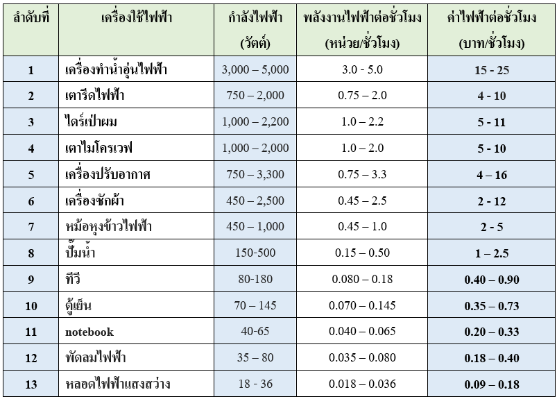 1. พลังงานไฟฟ้ามาจากไหน? พลังงาน หมายถึง ความสามารถในการทำงาน โดยทั่วไปแบ่งเป็นพลังงานไฟฟ้า ซึ่งมีเรียกกันหลายชื่อ เช่น กิโลวัตต์-ชั่วโมง (kWh) หรือหน่วยไฟฟ้า หรือ Unit) และพลังงานความร้อน ซึ่งเป็นพลังงานที่อยู่ในรูปของอุณหภูมิที่สูงหรือต่ำกว่าอุณหภูมิสิ่งแวดล้อม โดยทั่วไปใช้หน่วยเป็น เมกะจูล(MJ) พลังงานจำแนกตามลักษณะการนำมาใช้ประโยชน์เป็น 2 ประเภท คือ พลังงานสิ้นเปลือง (Conventional energy) และพลังงานหมุนเวียน (Renewable energy) พลังงานสิ้นเปลือง หมายถึง พลังงานที่ใช้แล้วหมดไป ไม่สามารถเกิดขึ้นมาใหม่ในระยะเวลาของวงจรชีวิตคนได้เช่น พลังงานที่ได้จากถ่านหิน หินน้ำมัน ทรายน้ำมัน น้ำมันดิบ น้ำมันเชื้อเพลิง ก๊าซธรรมชาติ และนิวเคลียร์ เป็นต้น บางครั้งเรียกว่า พลังงานฟอสซิล (Fossil Fuels) ซึ่งปัจจุบันประเทศไทยมีการนำมาใช้ประมาณ 70% โดยส่วนใหญ่เป็น ก๊าซธรรมชาติ น้ำมันเชื้อเพลิง และถ่านหิน พลังงานหมุนเวียน หมายถึง พลังงานที่ได้จากทรัพยากรธรรมชาติซึ่งสามารถเกิดขึ้นใหม่ได้ด้วยตัวเองหรือผลิตขึ้นใหม่ได้ เช่น ชีวมวล ชีวภาพ พลังงานแสงอาทิตย์ พลังงานน้ำ พลังงานความร้อนใต้พิภพ พลังงานลม พลังงานคลื่น เป็นต้น ซึ่งปัจจุบันประเทศไทยมีการใช้ประมาณ 30% โดยส่วนใหญ่เป็น พลังงานลม พลังงานแสงอาทิตย์ พลังงานชีวมวล พลังงานชีวภาพ และพลังงานน้ำ พลังงานไฟฟ้าไม่สามารถเกิดขึ้นได้ด้วยตนเอง แต่เกิดจากการแปรรูปของพลังงานสิ้นเปลือง และพลังงานหมุนเวียนในรูปแบบต่างๆไปเป็นพลังงานไฟฟ้า ทำให้ต้นทุนในการผลิตไฟฟ้าจากแหล่งต่างๆมีความแตกต่างกัน พลังงานไฟฟ้า(kWh) = กำลังไฟฟ้า x ชั่วโมงการใช้งาน (kWh หรือหน่วยไฟฟ้า หรือ Unit) เป็นตัวบอกว่าอุปกรณ์ไฟฟ้านั้นมีการใช้งานมากน้อยเท่าไร หรือบางที่เรียกว่ากินไฟกี่หน่วยนั่นเอง พลังไฟฟ้าหรือกำลังไฟฟ้า (Watt) = พลังงานไฟฟ้าต่อเวลา (จูล/ วินาที) เพื่อใช้บอกขนาดของอุปกรณ์ที่ใช้ไฟฟ้า เช่น หลอดไฟฟ้าขนาด 60 วัตต์ แผงโซลาเซลล์ ขนาด 550 วัตต์ เป็นต้น ค่าไฟฟ้าหรือค่าพลังงานไฟฟ้า = บาท/หน่วย หรือ บาท/kWh หรือ บาท/Unit 2. อุปกรณ์ใช้ไฟฟ้าในบ้านกินไฟมากไหม? แล้วจะประหยัดได้อย่างไร? ค่าไฟฟ้าต่อการเปิดใช้งาน 1 ชั่วโมง ที่ค่าไฟฟ้าเฉลี่ยเท่ากับ 5 บาทต่อหน่วย อุปกรณ์ใช้ไฟฟ้าบางชนิดใช้กำลังไฟฟ้ามาก แต่การใช้งานแต่ละครั้งใช้เวลาน้อย ก็จะใช้พลังงานไฟฟ้าน้อย ดังนั้นการใช้พลังงานไฟฟ้าอย่างมีประสิทธิภาพนั้นจะต้อง คิดก่อนใช้ ใช้เท่าที่จำเป็น ใช้ให้เกิดประโยชน์สูงสุด และเลือกซื้ออุปกรณ์ที่ได้มาตรฐานฉลากเบอร์ 5 ในขนาดที่เหมาะสมมาทดแทนของเดิม จะลดการใช้พลังงานไฟฟ้า