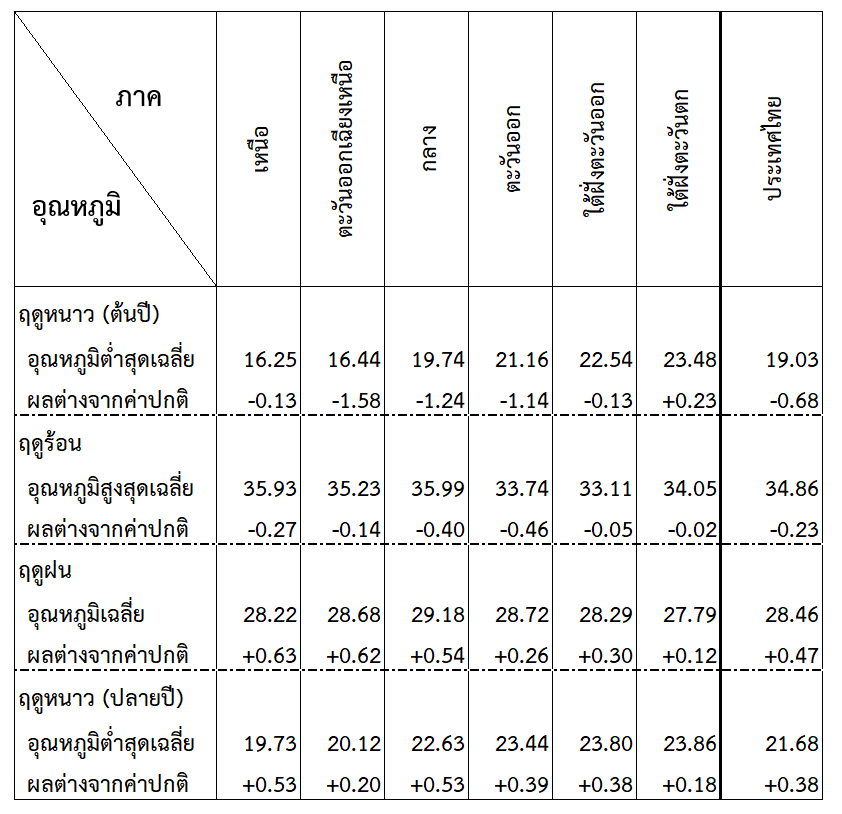 หมายเหตุ : 1.ข้อมูลจากสถานีตรวจอากาศผิวพื้น 72 สถานี 2.ค่าปกติ 30 ปี พ.ศ. 2534-2563 3.ฤดูหนาวต้นปี(1 ม.ค.-15 ก.พ.), ฤดูร้อน(16 ก.พ.-15 พ.ค.) ฤดูฝน(16 พ.ค.-15ต.ค.) และฤดูฝนปลายปี(16 ต.ค.-31 ธ.ค.) 2. การผลิตไฟฟ้าสำรองมากเกินไปไหม? สัดส่วนกำลังการผลิตไฟฟ้าจาก กฟผ. และโรงไฟฟ้าเอกชนมีดังนี้ กฟผ. = 32%, IPP = 31%, SPP = 17%, VSPP = 8% นำเข้าและแลกเปลี่ยน 12% จะเห็นว่า กฟผ. มีสัดส่วนการผลิตไฟฟ้าต่ำกว่า 50% คิดว่าเสถียรภาพการผลิตไฟฟ้าของประเทศดีหรือไม่ นั่นคือคำถามจากประชาชน ผู้ผลิตไฟฟ้าอิสระ (Independent Power Producer หรือ IPP) คือโรงไฟฟ้าขนาดใหญ่ ที่มีกำลังการผลิต มากกว่า 90 MW ซึ่งการไฟฟ้าฝ่ายผลิตแห่งประเทศไทย (กฟผ.) เป็นผู้รับซื้อ ผู้ผลิตไฟฟ้ารายเล็ก (Small Power Producer หรือ SPP) คือโรงไฟฟ้าขนาดเล็ก ที่มีกำลังการผลิต 10-90 MW ซึ่งการไฟฟ้าฝ่ายผลิตแห่งประเทศไทย (กฟผ.) เป็นผู้รับซื้อ ผู้ผลิตไฟฟ้ารายเล็กมาก (Very Small Power Producer หรือ VSPP) คือโรงไฟฟ้าขนาดเล็กมาก ที่มีกำลังการผลิตน้อยกว่า 10 MW ซึ่งการไฟฟ้านครหลวง (กฟน.) และการไฟฟ้าส่วนภูมิภาค (กฟภ.) เป็นผู้รับซื้อ การผลิตไฟฟ้าสำรอง กำลังผลิตไฟฟ้าตามสัญญา (ม.ค.2566) รวม 53,384 MW ซึ่งค่าความต้องการพลังไฟฟ้าสูงสุด(Peak) ของปี 2565 ประมาณ 33,177 MW กำลังการผลิตไฟฟ้าสำรอง คิดรวมโรงไฟฟ้าทุกประเภท = (53,384-33,177) / 33,177 = 61 % กำลังการผลิตไฟฟ้าสำรอง คิดเฉพาะโรงไฟฟ้าที่ผลิตได้เสถียร = (45,225-33,177) / 33,177 = 36 % มาตรฐานการผลิตไฟฟ้าสำรองควรมีค่า ประมาณ 15-20 การที่การผลิตไฟฟ้าสำรองสูงมากนั้นเป็นปัจจัยหนึ่งที่ส่งผลให้ค่าไฟฟ้าสูงขึ้น เนื่องจาก กฟฝ. จะต้องเสียค่าพร้อมจ่าย(AP) มากขึ้น