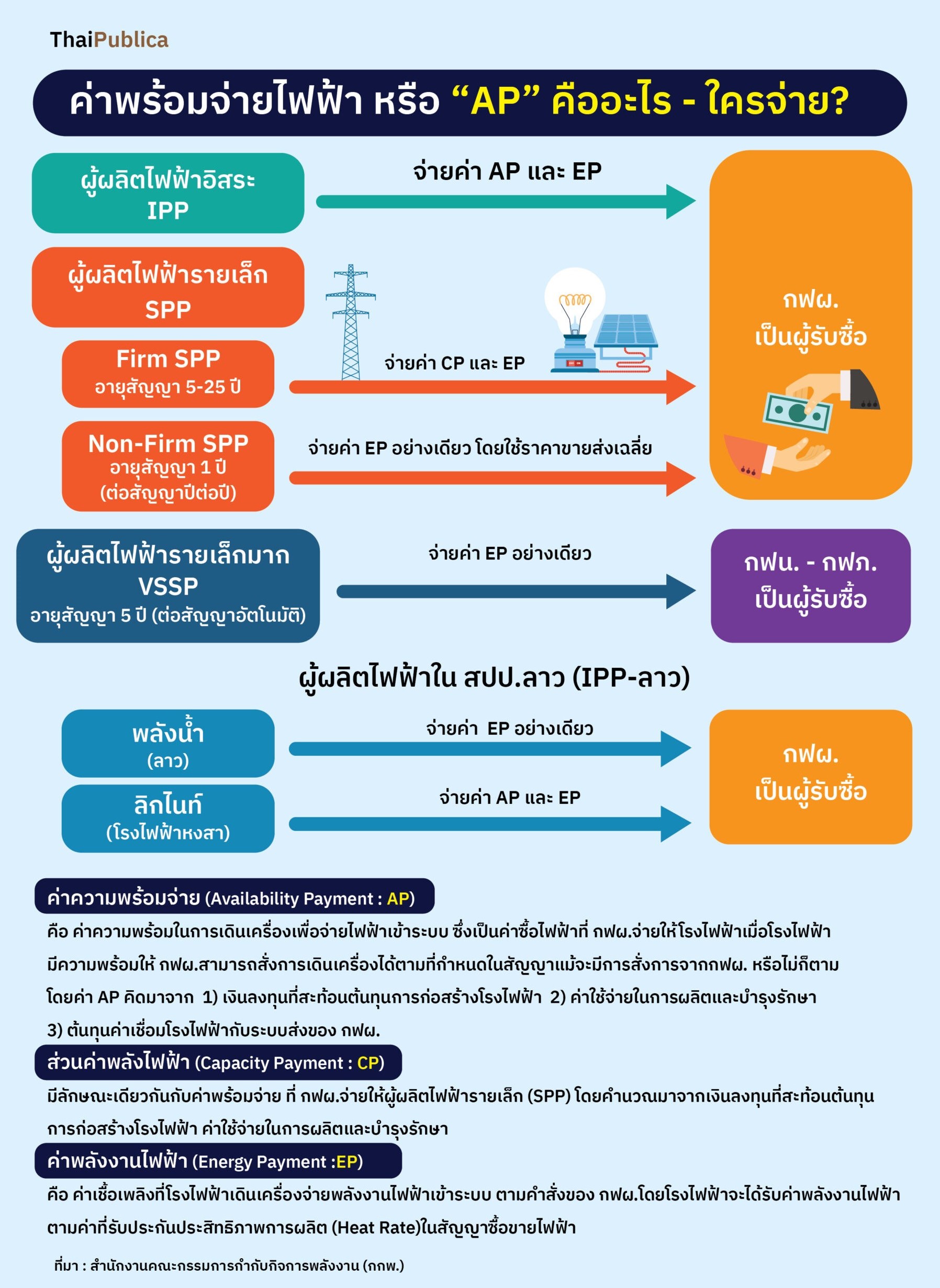 วิธีคำนวณประมาณการซื้อไฟฟ้าของ กฟผ. ที่ซื้อจากเอกชน ที่ส่งผลต่อค่า Ft ดังนี้ ค่าความพร้อมจ่าย (Availability Payment :AP) + ค่าพลังงานไฟฟ้า (Energy Payments: EP) + ค่าใช้จ่ายตามนโยบายของรัฐ (Policy Expense: PE) AP คือ ค่าความพร้อมจ่าย หรือค่าความพร้อมเดินเครื่องเพื่อจ่ายไฟฟ้า เป็นแนวทางปฏิบัติตามหลักสากลสำหรับสัญญาซื้อขายไฟฟ้าระยะยาว เพื่อสะท้อนต้นทุนค่าก่อสร้างโรงไฟฟ้าที่เอกชนต้องลงทุน เช่น ค่าเช่า ค่าอุปกรณ์อะไหล่โรงไฟฟ้า ค่าจ้างเดินเครื่องหรือบำรุงรักษา ค่าประกันภัยโรงไฟฟ้า ฯลฯ ที่ต้องจ่ายทุกเดือน ไม่ว่าโรงไฟฟ้าจะผลิตหรือไม่ผลิตก็ตาม ซึ่งปัจจุบันค่าใช้จ่ายส่วนนี้ประมาณ 80 สต.ต่อหน่วย จากข้อมูลพบว่า IPP จำนวนมากผลิตไฟฟ้าน้อยมากและบางแห่งไม่มีการผลิต เนื่องจากมีการสำรองไฟฟ้าไว้สูง (ค่านี้เปลี่ยนแปลงตามสัญญาการรับซื้อเข้าระบบเหมือนกับสัญญาการเช่ารถมาใช้ในหน่วยงานถ้าไม่ใช้ก็ต้องเสียค่าใช้จ่าย) โรงไฟฟ้าพลังงานหมุนเวียนที่ทำสัญญาใหม่ไม่ต้องเสียค่าพร้อมจ่าย EP คือ ค่าพลังงานไฟฟ้า เป็นค่าเชื้อเพลิงที่โรงไฟฟ้าเอกชนจะได้รับก็ต่อเมื่อศูนย์ควบคุมระบบไฟฟ้าสั่งการให้โรงไฟฟ้าจ่ายไฟฟ้า โดยโรงไฟฟ้าต้องรับประกันประสิทธิภาพการผลิตไฟฟ้าว่า ผลิตไฟฟ้า 1 หน่วย ต้องใช้เชื้อเพลิงเท่าใด ในช่วงเวลาที่ราคาเชื้อเพลิงสูงค่านี้ก็จะสูงขึ้นด้วย โดยปัจจัยหลักที่ทำให้สูงขึ้นเกิดจาก 1. ที่ผ่านมานโยบายรัฐ พยายามลดการใช้ถ่านหินในการผลิตไฟฟ้า ทำให้ต้องใช้เชื้อเพลิงอื่นที่มีต้นทุนสูงกว่าเพิ่มมากขึ้น เช่น ก๊าซธรรมชาติ เพิ่มขึ้น น้ำมันเตา น้ำมันดีเซลเพิ่มขึ้น เป็นต้น 2. ที่ผ่านมามีปัญหาการผลิตก๊าซธรรมชาติจากอ่าวไทยลดลงจากการประมูลสัมปทานใหม่ โดยเปลี่ยนจากกลุ่มเชฟรอน เป็น ปตท.สผ. ทำให้เกิดช่องว่างรอยต่อ 3. ที่ผ่านมาก๊าซธรรมชาติจากเมียนมาร์ผลิตได้ลดลง 4. สงครามรัสเซีย – ยูเครน และการตัดท่อส่งก๊าซที่รัสเซียส่งไปยุโรป ส่งผลให้ราคาก๊าซธรรมชาติเหลวที่นำเข้า(LNG) เพิ่มสูงขึ้นมาก 5. ความผันผวนของราคาพลังงานโลก ประเทศไทยผลิตก๊าซธรรมชาติใช้เองประมาณ 66% และนำเข้าประมาณ 34% โดยนำเข้าจากเมียนมาร์ประมาณ 16% และนำเข้าในรูปก๊าซธรรมชาติเหลว(LNG)ประมาณ 18% ส่งผลให้ต้นทุนก๊าซธรรมชาติที่ใช้ในการผลิตไฟฟ้าสูงขึ้น PE คือ ค่าใช้จ่ายตามนโยบายของรัฐ เป็นค่าใช้จ่ายจากโครงการต่างๆที่รัฐส่งเสริมสนับสนุน