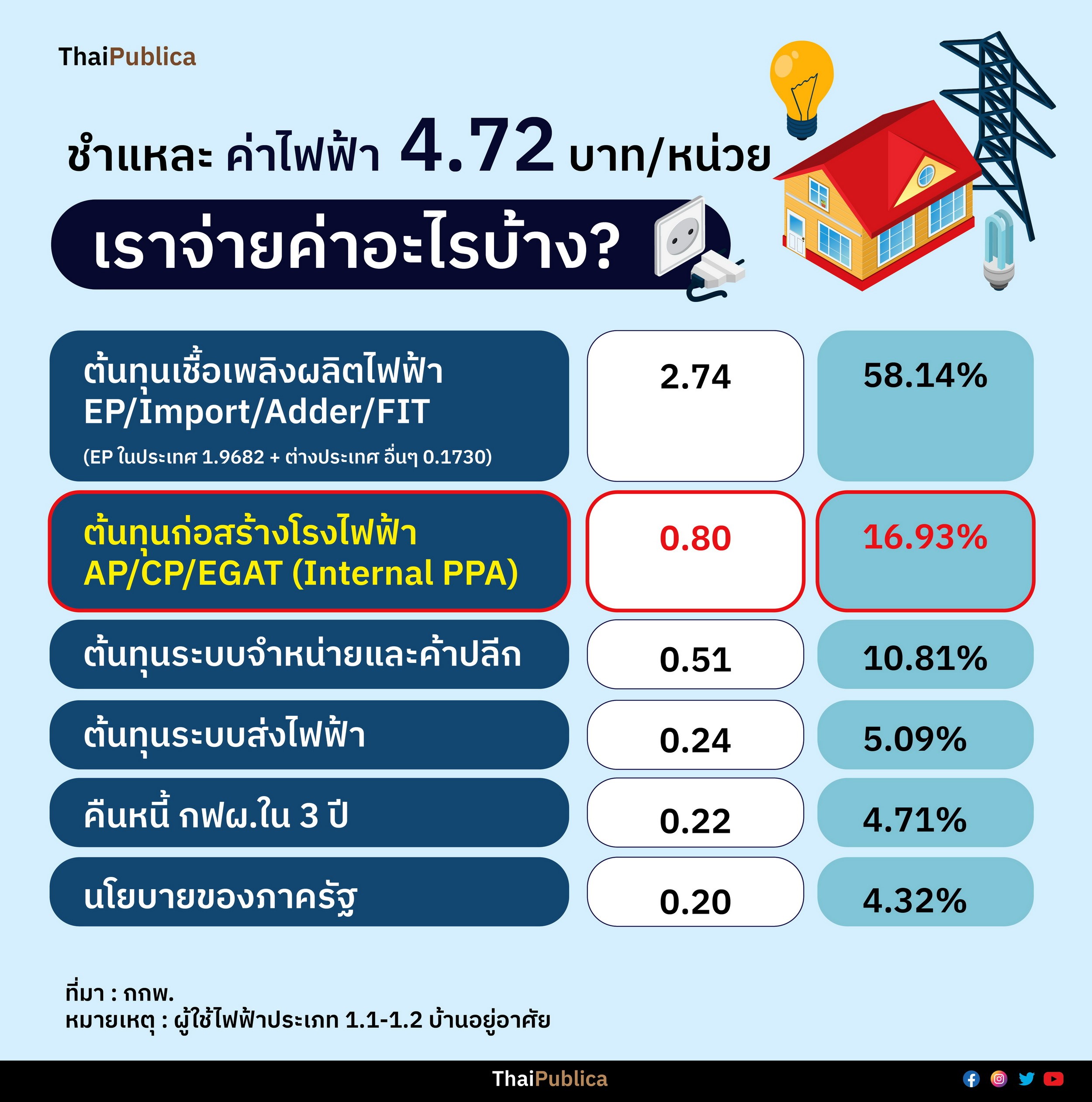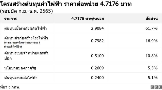 โครงสร้างต้นทุนค่าไฟฟ้าต่อหนึ่งหน่วย ประกอบไปด้วย 5 ส่วน ดังนี้ 1. ต้นทุนเชื้อเพลิงในการผลิตไฟฟ้า ซึ่งรวมการซื้อไฟฟ้าเข้าระบบ การนำเข้าไฟฟ้าจากต่างประเทศ และค่า Adder ค่า FiT 2. ต้นทุนการก่อสร้างโรงไฟฟ้า ของกฟผ. และเอกชน (ค่าความพร้อมจ่าย (AP)) 3. ต้นทุนระบบจำหน่ายและค้าปลีก ของการไฟฟ้านครหลวง (กฟน.) และการไฟฟ้าส่วนภูมิภาค (กฟภ.) 4. นโยบายของภาครัฐ 5. ต้นทุนระบบส่งไฟฟ้าของ กฟผ. จากข้อมูลโครงสร้างต้นทุนของเดือน ก.ย.- ธ.ค. 2565 พบว่าต้นทุนเชื้อเพลิงก๊าซธรรมชาติซึ่งเป็นเชื้อเพลิงที่ใช้ในอัตราที่มากที่สุดสูงขึ้น ส่งผลให้ต้นทุนค่าเชื้อเพลิงสูงถึง 2.91 บาทต่อหน่วย นอกจากนั้นอันดับที่สองคือ ต้นทุนค่าก่อสร้างโรงไฟฟ้าประมาณ 80 สตางค์ ซึ่งหลักๆของค่านี้คือค่าพร้อมจ่าย (AP) ซึ่งถ้าเทียบกับปีฐาน 2558 แล้ว ค่าความพร้อมจ่าย (AP) ที่ต้องจ่ายให้โรงไฟฟ้าเอกชนขนาดเล็ก (SPP) เพิ่มขึ้นในอัตราที่สูงกว่าค่าความพร้อมจ่ายของโรงไฟฟ้าขนาดใหญ่และโรงไฟฟ้าของ กฟผ. เนื่องจากจำนวนของ SPP ที่เพิ่มขึ้นมาก และสัญญา SPP ตามนโยบายต้องมีการเดินเครื่อง ซึ่งเป็นสัญญาที่ต้องซื้อ (Must Take) แม้ต้นทุนจะสูงกว่า IPP ทำให้ต้องลดกำลังการผลิตของ IPP อีกทั้งโรงไฟฟ้าจากพลังงานหมุนเวียนก็ต้องซื้อตามสัญญา ทำให้ต้นทุนในภาพรวมสูงขึ้น (สัญญาและนโยบายรัฐส่งผลต่อต้นทุนราคาไฟฟ้า)