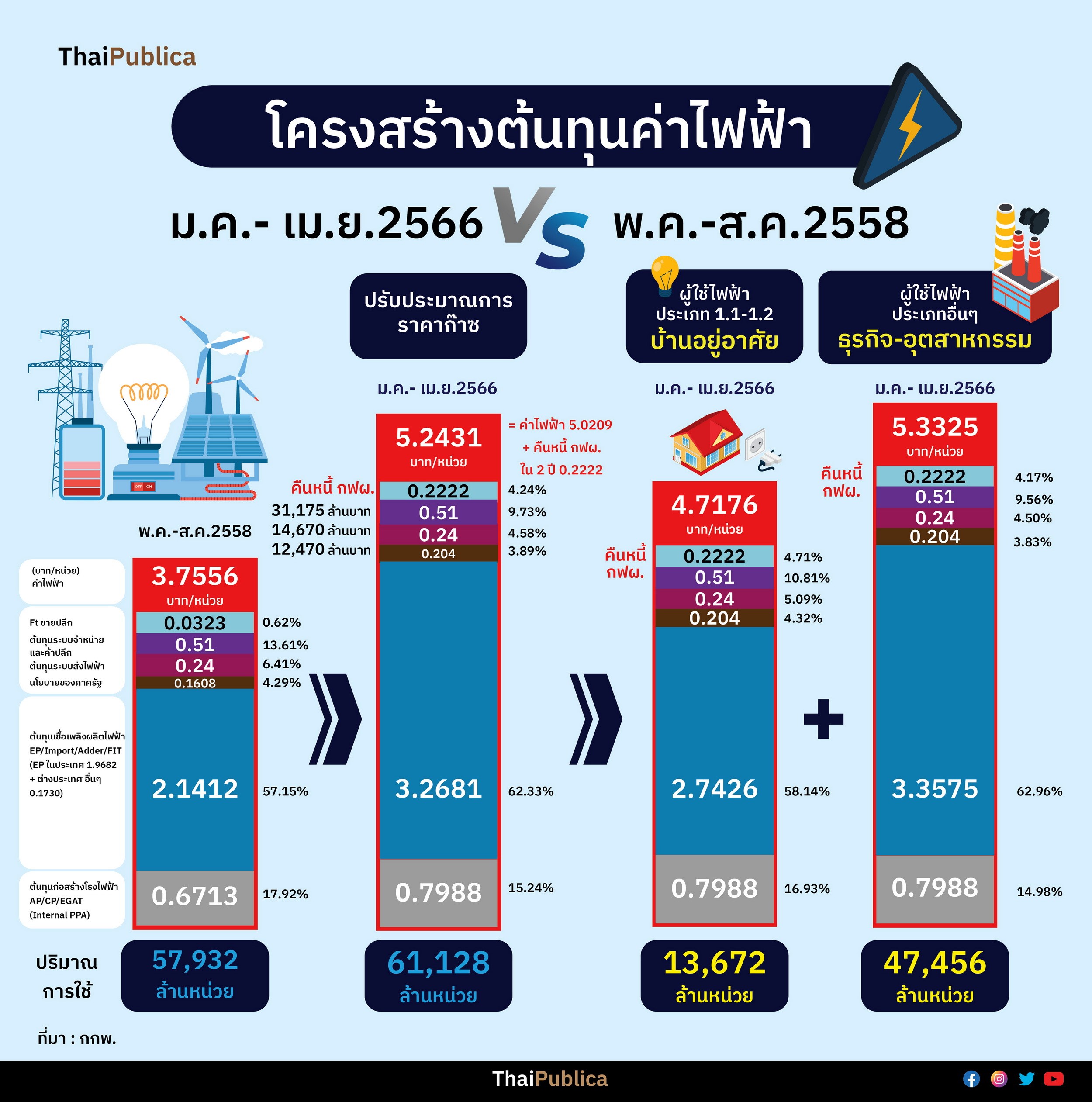 การคำนวณตามนโยบาย กพช.(คณะกรรมการนโยบายพลังงานแห่งชาติ) เริ่มจากปีที่มีการปรับค่าไฟฟ้าฐาน ช่วงเดือนพฤษภาคมถึงเดือนสิงหาคม 2558 เปรียบเทียบกับ งวดปัจจุบัน ในช่วงเดือนมกราคมถึงเดือนเมษายน 2566 จะเห็นว่าต้นทุนที่มีการเปลี่ยนแปลง และมีผลทำให้ค่าไฟฟ้าแพงขึ้นมีอยู่ 3 ส่วน ดังนี้ ส่วนที่ 1 ต้นทุนค่าก่อสร้างโรงไฟฟ้า ประกอบด้วย ค่า AP ของโรงไฟฟ้าของ กฟผ. ค่า AP ที่ กฟผ.จ่ายให้กับโรงไฟฟ้าเอกชน ทั้ง IPP และ SPP จากการคำนวณในปี 2558 ในบิลค่าไฟฟ้าจะมีต้นทุนค่าก่อสร้างโรงไฟฟ้าเฉลี่ย 0.67 บาท/หน่วย ส่วนปัจจุบันในปี 2566 มีค่าเฉลี่ย 0.79 บาท/หน่วย ซึ่งเพิ่มจากปีฐานประมาณ 10 สตางค์/หน่วย คิดเป็นร้อยละ 18 ถ้าคิดเทียบกับค่าไฟฟ้ารวมแล้วเพิ่มขึ้นประมาณร้อยละ 2.66 เท่านั้นซึ่งถือว่าต้นทุนส่วนนี้เพิ่มขึ้นไม่มาก เนื่องจากโรงไฟฟ้าเอกชนมีทั้งเพิ่มขึ้นและหมดสัญญา ส่วนที่ 2 ต้นทุนค่าเชื้อเพลิงผลิตไฟฟ้า ในส่วนนี้มีการเพิ่มสูงขึ้นมาก โดยบิลค่าไฟฟ้าในปี 2558 จะมีต้นทุนค่าเชื้อเพลิงเฉลี่ย 2.14 บาท/หน่วย ส่วนปัจจุบันในปี 2566 เฉลี่ย 3.27 บาท/หน่วย เพิ่มขึ้น 1.13 บาท/หน่วย คิดเป็นร้อยละ 52.80 สาเหตุมาจากก๊าซธรรมชาติในอ่าวไทยผลิตได้น้อย จึงต้องนำเข้า LNG และน้ำมันเตา ดีเซล ซึ่งมีราคาสูงมาใช้ในการผลิตไฟฟ้าแทน อีกทั้งปัญหาราคาพลังงานของโลกที่เปลี่ยนแปลง ส่วนที่ 3 ต้นทุนจากการดำเนินการตามนโยบายรัฐ ในบิลค่าไฟฟ้าปี 2558 มีต้นทุนส่วนนี้เฉลี่ย 0.16 บาท/หน่วย ส่วนงวดปัจจุบันมีต้นทุนเฉลี่ยอยู่ที่ 0.20 บาท/หน่วย เพิ่มขึ้นมาเพียง 4 สตางค์/หน่วย คิดเป็นการเพิ่มจากเดิมร้อยละ 25 ถ้าคิดเทียบกับค่าไฟฟ้ารวมแล้วเพิ่มขึ้นประมาณร้อยละ 1.06 เท่านั้น ซึ่งเพิ่มขึ้นน้อยมาก ซึ่งส่วนนี้รัฐมีการสนับสนุนพลังงานหมุนเวียนจะเพิ่มขึ้นอย่างต่อเนื่อง ตามมติคณะกรรมการนโยบายพลังงานแห่งชาติ (กพช.) ให้ กกพ. ทำการแยกผู้ใช้ไฟฟ้าประเภทบ้านอยู่อาศัยออกมาจากผู้ใช้ไฟฟ้าประเภทอื่น โดยนำก๊าซธรรมชาติจากอ่าวไทยซึ่งมีราคาถูกที่สุดและเป็นของประชาชนทุกคน มาใช้ในการผลิตไฟฟ้าขายให้กับผู้ใช้ไฟฟ้าประเภทบ้านอยู่อาศัยก่อน ทำให้ต้นทุนค่าเชื้อเพลิงลดลงจาก 3.27 บาท/หน่วย เป็น 2.74 บาท/หน่วย ทำให้ค่าไฟฟ้าที่เรียกเก็บจากผู้ใช้ไฟฟ้าประเภทบ้านอยู่อาศัยเฉลี่ยอยู่ที่ 4.72 บาท/หน่วย ในส่วนผู้ใช้ไฟฟ้าประเภทอื่นนั้นให้คิดจากก๊าซธรรมชาติจากอ่าวไทยที่เหลือรวมกับเชื้อเพลิงประเภทอื่นๆ ทำให้ต้นทุนค่าเชื้อเพลิงเพิ่มขึ้นจาก 3.27 บาท/หน่วย เป็น 3.36 บาท/หน่วย ทำให้ค่าไฟฟ้าที่เรียกเก็บจากผู้ใช้ไฟฟ้าประเภทอื่น เพิ่มขึ้นจาก 5.24 บาท/หน่วย เป็น 5.33 บาท/หน