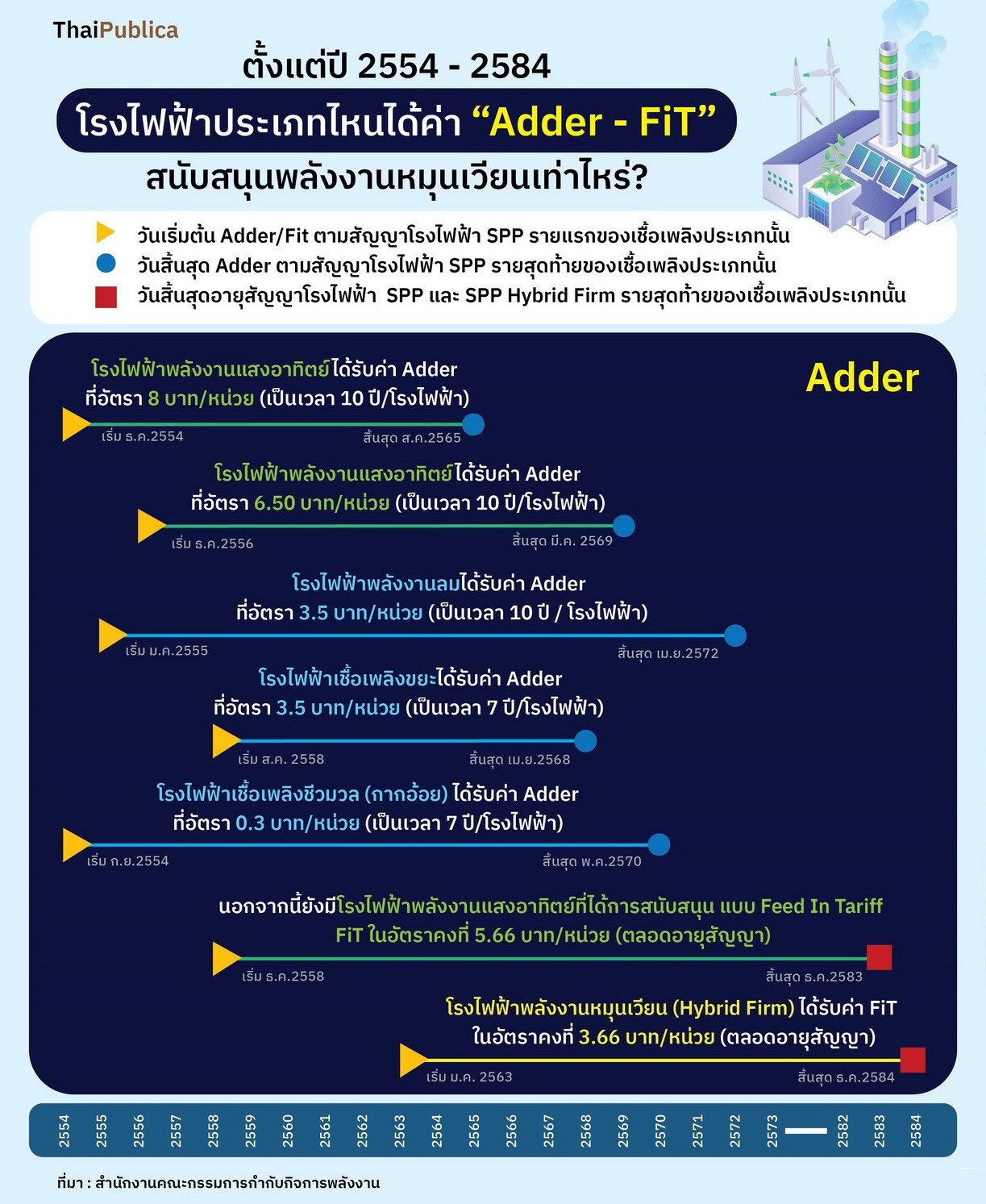 |      จากนโยบายรัฐในการสนับสนุนพลังงานหมุนเวียนในรูปแบบของค่า Adder โดย กฟผ. ต้องจ่ายให้ผู้ผลิตไฟฟ้ารายเล็ก (SPP) จำนวน 44 โรง ส่วน กฟน. และ กฟภ. จ่ายค่า Adder ให้กับผู้ผลิตไฟฟ้ารายเล็กมาก(VSPP) รวมทั้งรับซื้อไฟฟ้าจากโครงการพลังงานแสงอาทิตย์ที่ติดตั้งบนหลังคา และโรงไฟฟ้าชุมชน ในรูปแบบค่า FiT โดยมีรายละเอียดดังนี้   1. โรงไฟฟ้าพลังงานแสงอาทิตย์ ได้รับค่า Adder ในอัตรา 8 บาท/หน่วย เป็นเวลา 10 ปี สัญญาแรกเริ่มจ่ายเดือนธันวาคม 2554 และสิ้นสุดสัญญาในเดือนสิงหาคม 2565 ต่อมาในปี 2556 ได้มีการปรับลดค่า Adder เป็นหน่วยละ 6.5 บาท โดยสัญญาแรกเริ่มจ่ายเดือนธันวาคม 2556 และสัญญาสุดท้ายสิ้นสุดสัญญาเดือนมีนาคม 2569