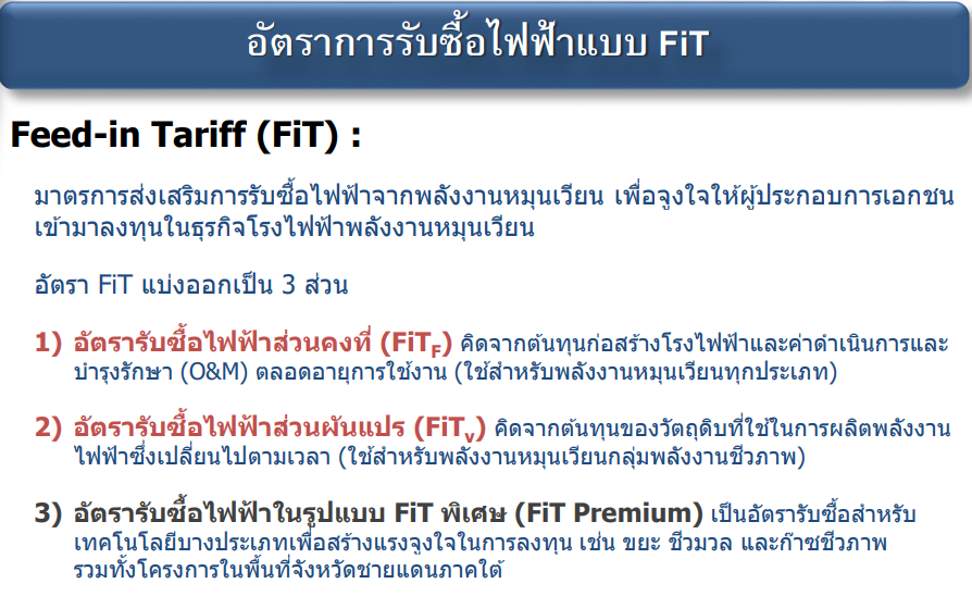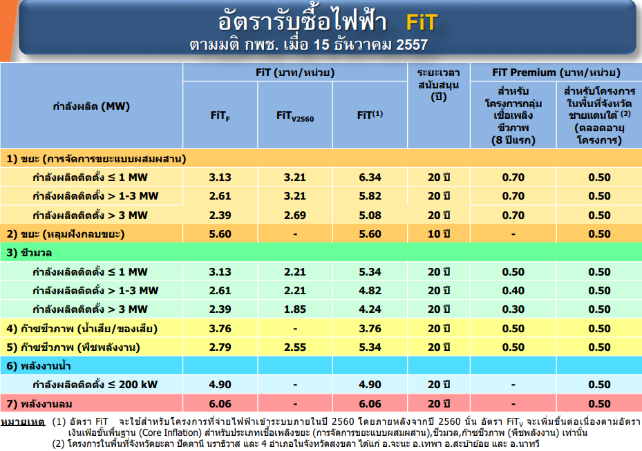 5. โรงไฟฟ้าพลังงานแสงอาทิตย์ ได้รับการสนับสนุนค่าซื้อไฟฟ้าในรูปแบบของ FiT ในอัตราคงที่ 5.66 บาท/หน่วย ตลอดอายุสัญญา โดยสัญญาแรกเริ่มตั้งแต่เดือนธันวาคม 2558 และสัญญาสุดท้ายสิ้นสุดในเดือนธันวาคม 2583