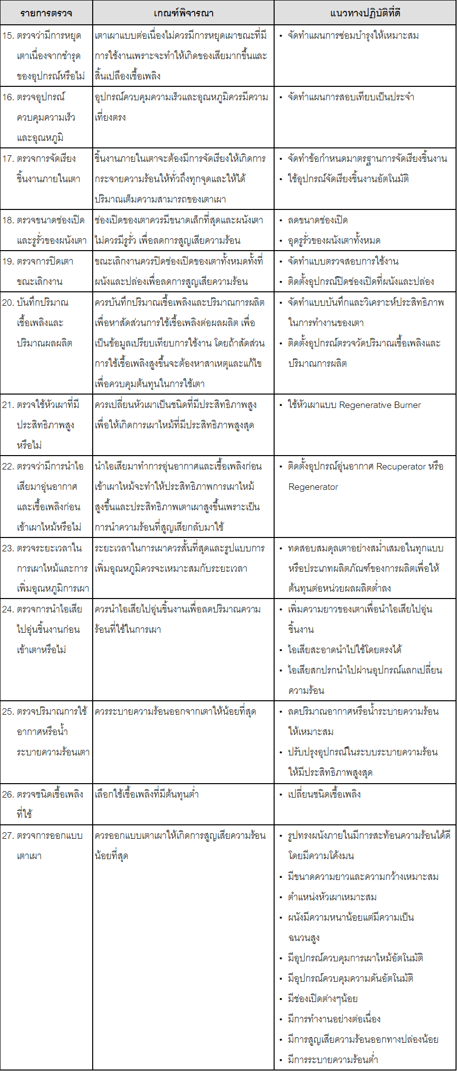 การตรวจวินิจฉัย เตาเผา เตาอบ การตรวจวินิจฉัย เตาเผา เตาอบ เป็นการตรวจสภาพการใช้งานและการบำรุงรักษาเพื่อให้ทราบว่าปัจจุบันมีสภาพเป็นเช่นไร สามารถปรับปรุง เปลี่ยนแปลงอะไรบ้างเพื่อให้เกิดการประหยัดพลังงาน รวมทั้งยืดอายุการใช้งาน และลดค่าใช้จ่ายในการซ่อมบำรุง โดยมีแนวทางดังนี้ |