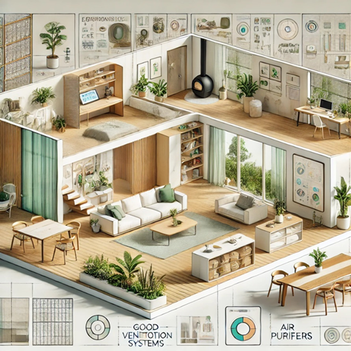 การระบายอากาศภายในบ้านเป็นสิ่งสำคัญเพื่อให้มีอากาศที่บริสุทธิ์หมุนเวียนอยู่เสมอ บ้านเพื่อสุขภาพควรออกแบบให้มีช่องหน้าต่างและช่องระบายอากาศที่เหมาะสมเพื่อให้อากาศสามารถหมุนเวียนได้ดี การใช้พัดลมระบายอากาศในห้องน้ำและห้องครัวจะช่วยลดการสะสมของสารเคมีและความชื้นในบ้าน นอกจากนี้ การติดตั้งระบบระบายอากาศที่มีประสิทธิภาพและเครื่องฟอกอากาศที่ช่วยกำจัดฝุ่นละอองและสารก่อภูมิแพ้ก็เป็นอีกหนึ่งวิธีที่ช่วยให้บ้านมีคุณภาพอากาศที่ดีขึ้น