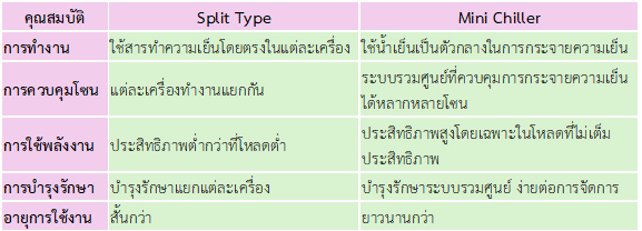 Split Type Air Conditioners แต่ละเครื่องทำงานแยกกัน ทำให้ไม่สามารถปรับโหลดรวมเพื่อประหยัดพลังงานได้เหมือนระบบ Mini Chiller