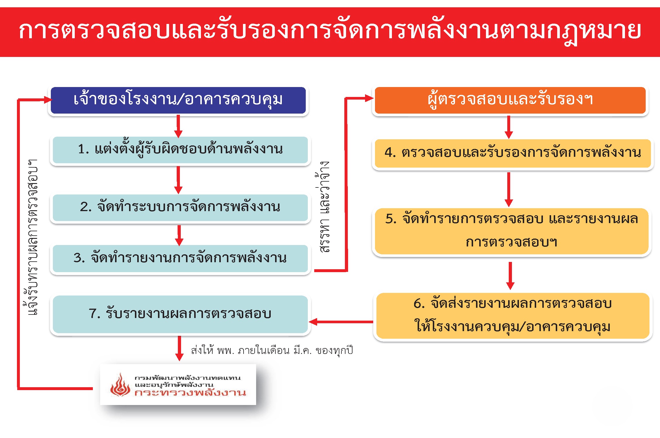 เจ้าของโรงงานควบคุมและเจ้าของอาคารควบคุมต้องจัดให้มีการตรวจสอบและรับรองการจัด การพลังงาน โดยผู้ตรวจสอบและรับรองที่ได้ขึ้นทะเบียนไว้กับกรมพัฒนาพลังงานทดแทนและอนุรักษ์พลังงาน ตามกฎกระทรวงกําหนดคุณสมบัติของผู้ขอรับใบอนุญาต หลักเกณฑ์ วิธีการ และเงื่อนไขการขอรับใบอนุญาต และการอนุญาตตรวจสอบและรับรองการจัดการพลังงาน พ.ศ. 2555 ตามรายละเอียดในภาคผนวก ก.7 และส่งรายงานดังกล่าวให้แก่อธิบดีกรมพัฒนาพลังงานทดแทนและอนุรักษ์พลังงานภายในเดือนมีนาคมของทุกปี