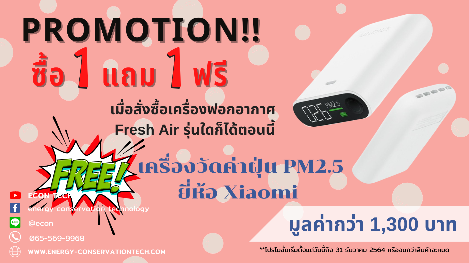 โปรโมชั่นตอนนี้ แถมฟรี!! เครื่องวัดค่าฝุ่น PM2.5 ยี่ห้อ Xiaomi มูลค่ากว่า 1,300 บาท เมื่อซื้อเครื่องฟองอากาศ Fresh Aif รุ่นใดก็ได้