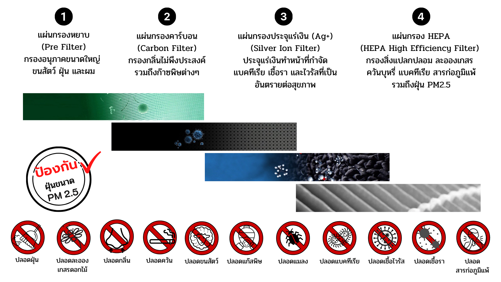 ช่วยกำจัดฝุ่นขนาดเล็กอย่าง PM2.5 เชื้อโรคต่างๆ กลิ่นไม่พึงประสงค์ สารก่อภูมิแพ้ ไวรัสในอากาศที่เป็นอันตรายต่อสุขภาพ
